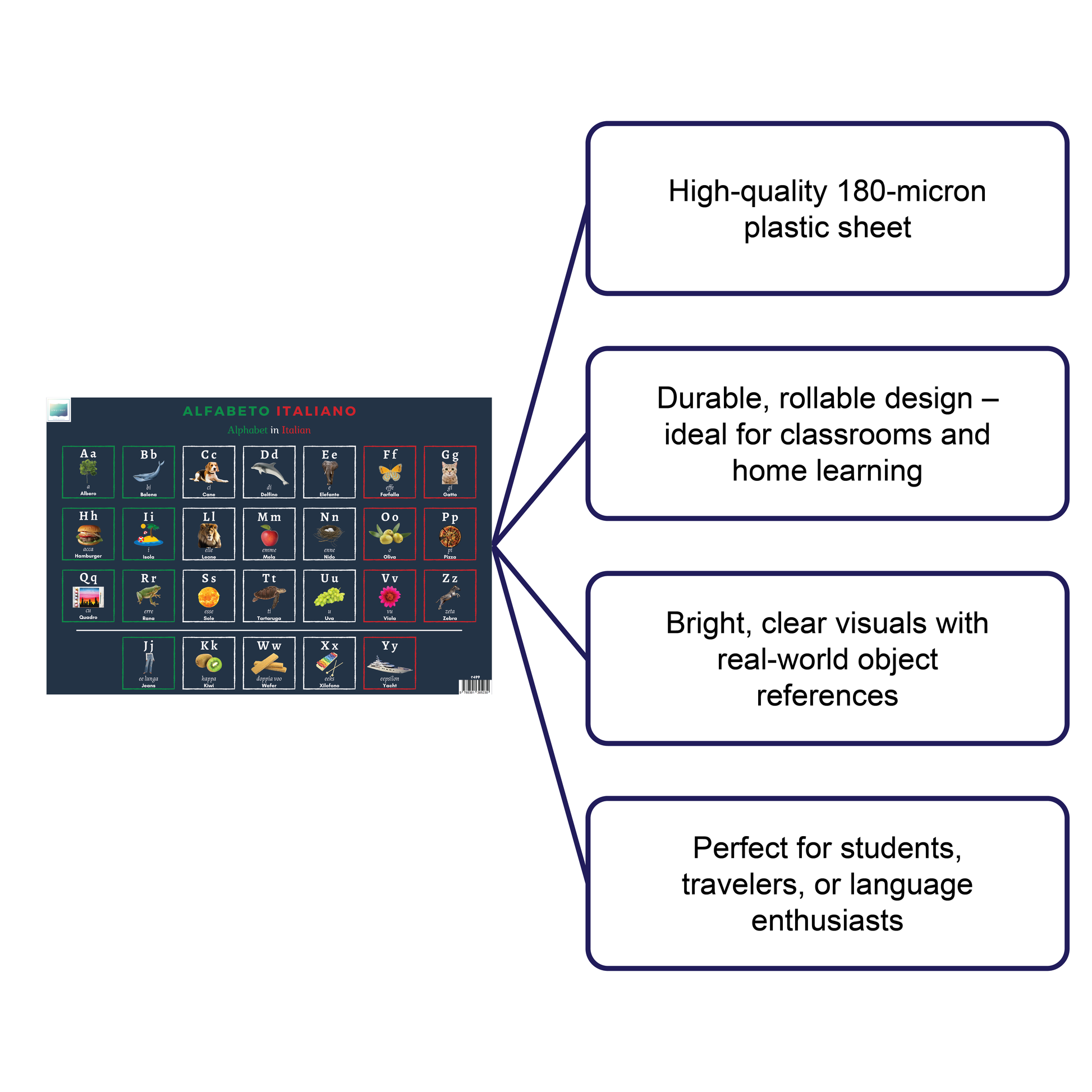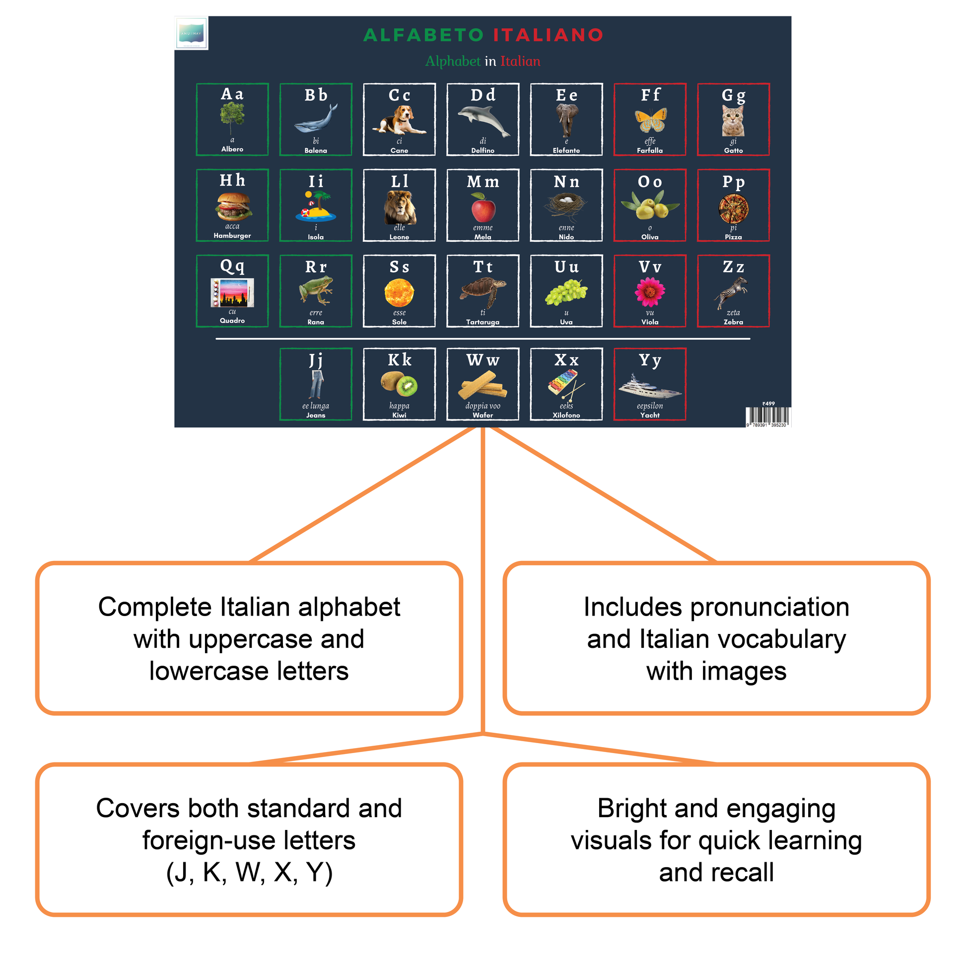 Use it in classrooms, study areas, or during online lessons to reinforce alphabet recognition. Its visual appeal and educational value make it a staple for Italian language learners of all ages.