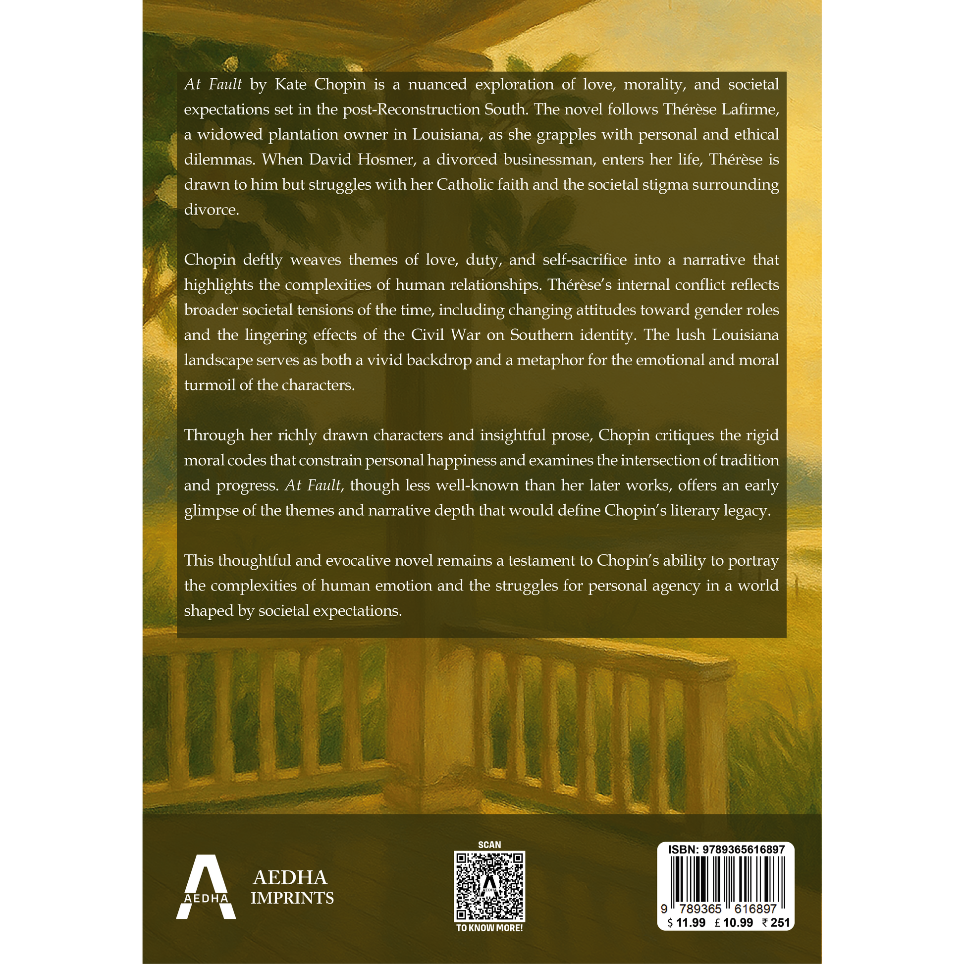 A deeply introspective novel set in post-Reconstruction Louisiana, At Fault explores themes of love, morality, gender roles, and societal pressure through the journey of a widowed plantation owner. Kate Chopin’s early novel showcases her budding literary voice, examining emotional conflict and personal agency. This Aedha Classics paperback edition is thoughtfully designed and made in India—ideal for lovers of feminist literature, historical fiction, and Southern American storytelling.