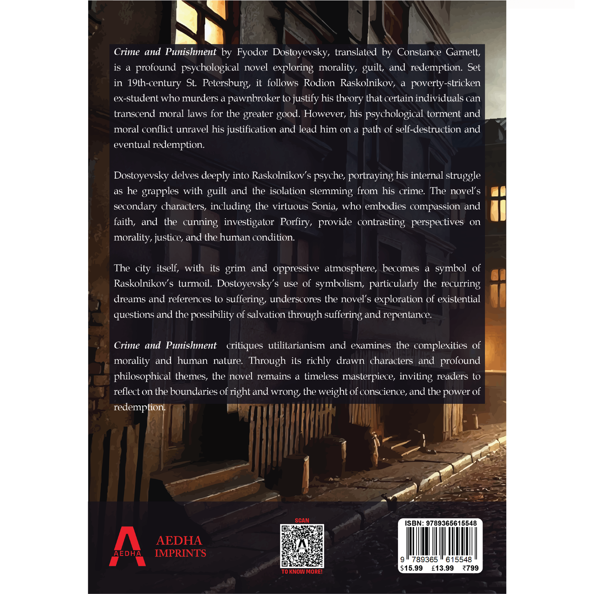 Crime and Punishment by Fyodor Dostoyevsky is a profound psychological novel that delves into morality, guilt, and redemption. Set in 19th-century St. Petersburg, the story follows Rodion Raskolnikov, a poverty-stricken former student, as he murders a pawnbroker to justify his theory that certain individuals can transcend moral and legal boundaries for the greater good. However, his psychological torment and moral conflict unravel his justification, leading him down a path of self-destruction and eventual redemption.