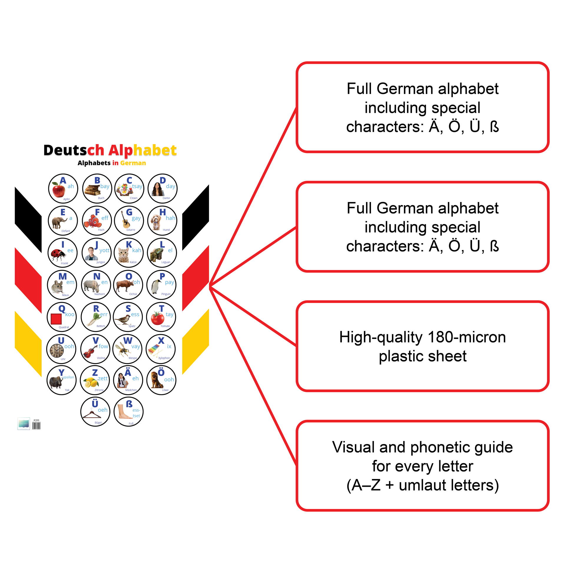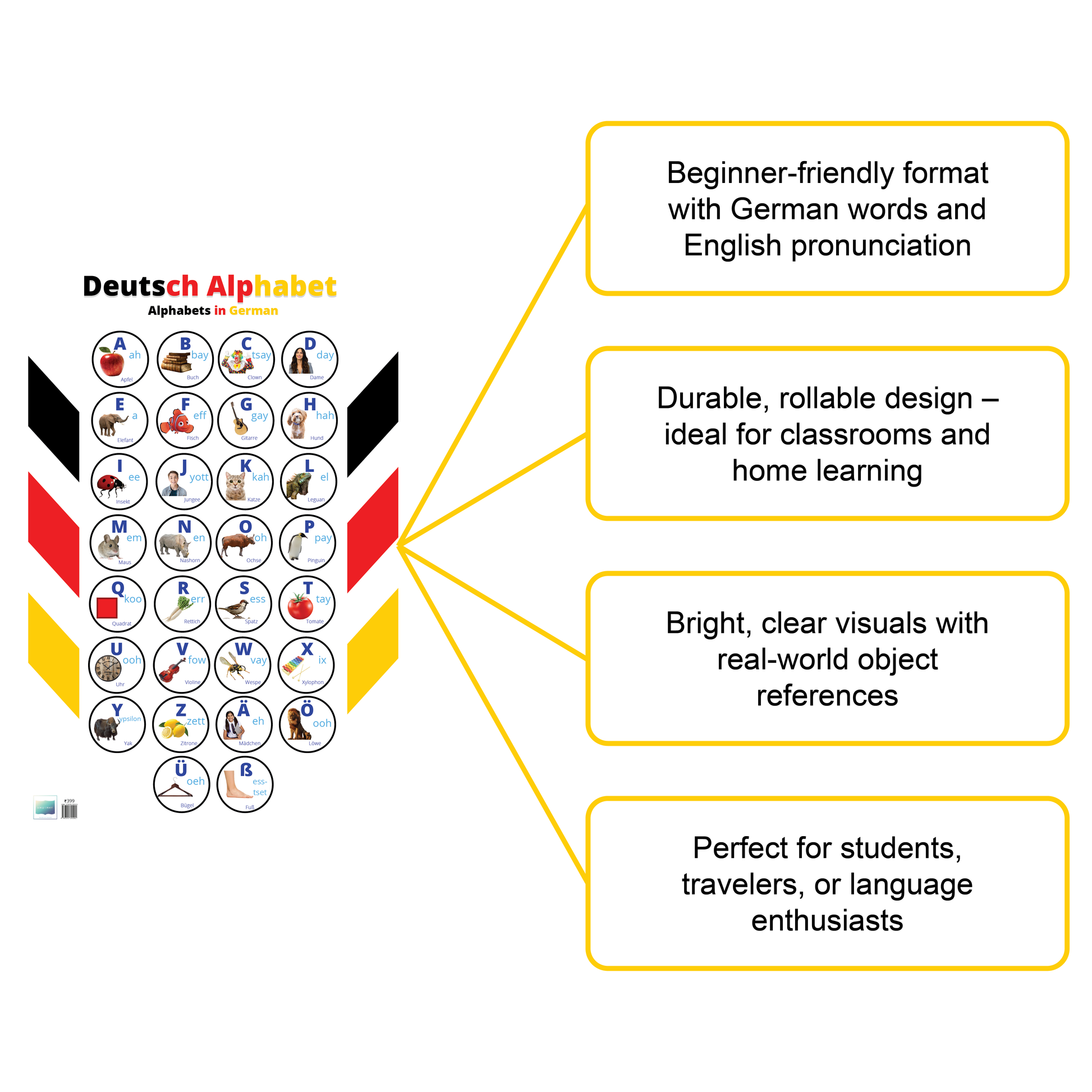 This Deutsch Alphabet Poster is the ultimate beginner tool to learn and memorize German alphabets with ease. From A to Z and beyond—with characters like Ä, Ö, Ü, and ß—it provides a clear and colorful reference for new learners. Each letter includes a German word, its pronunciation in English, and a vivid image to aid memory and recognition.