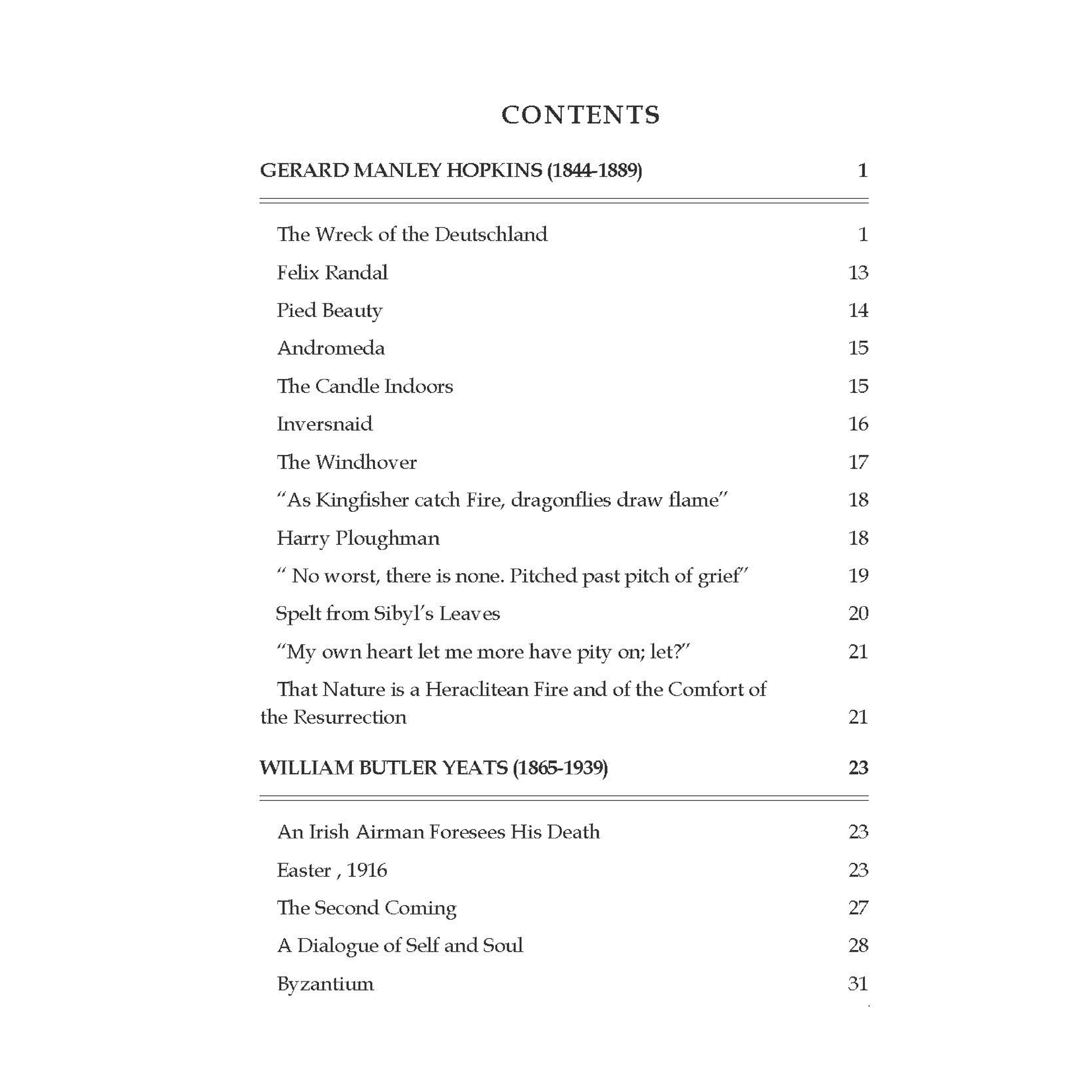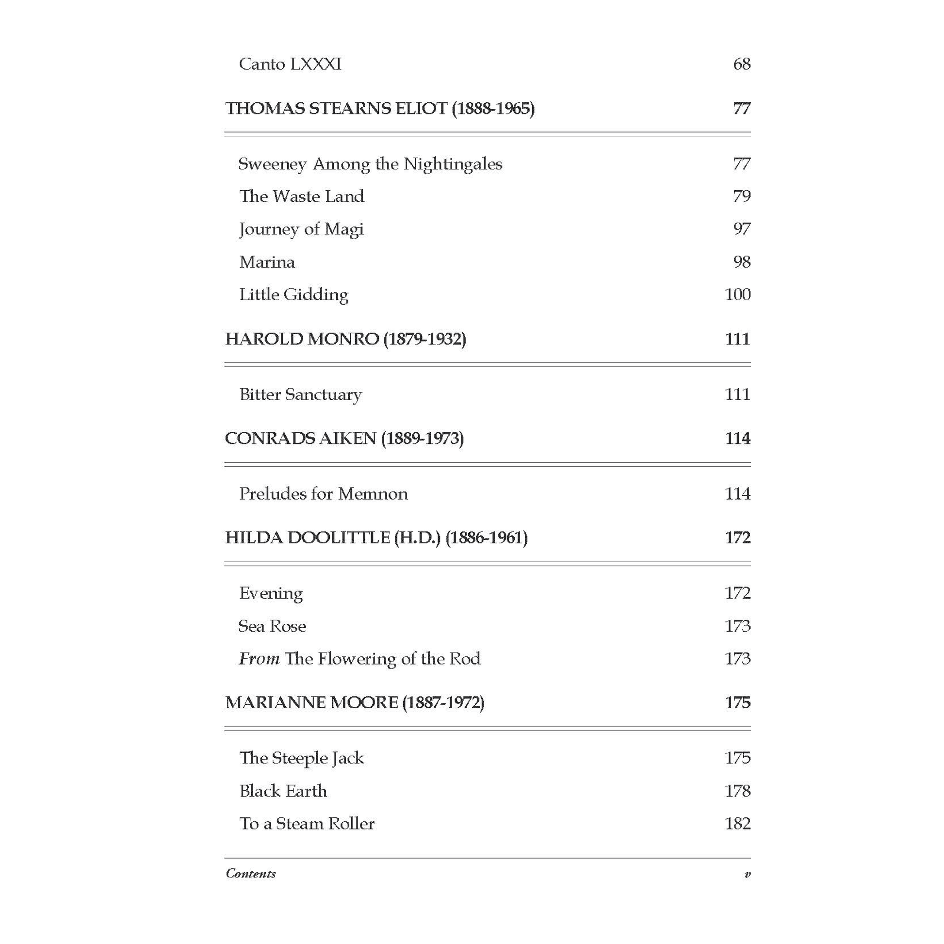 This collection includes renowned poets such as William Butler Yeats, T.S. Eliot, Ezra Pound, Wallace Stevens, Marianne Moore, Wilfred Owen, Langston Hughes, and many more. Their works span from the lyrical beauty of Yeats, the philosophical depth of Eliot, to the poignant war poetry of Owen, showcasing the shifting perspectives of modern poetry.
