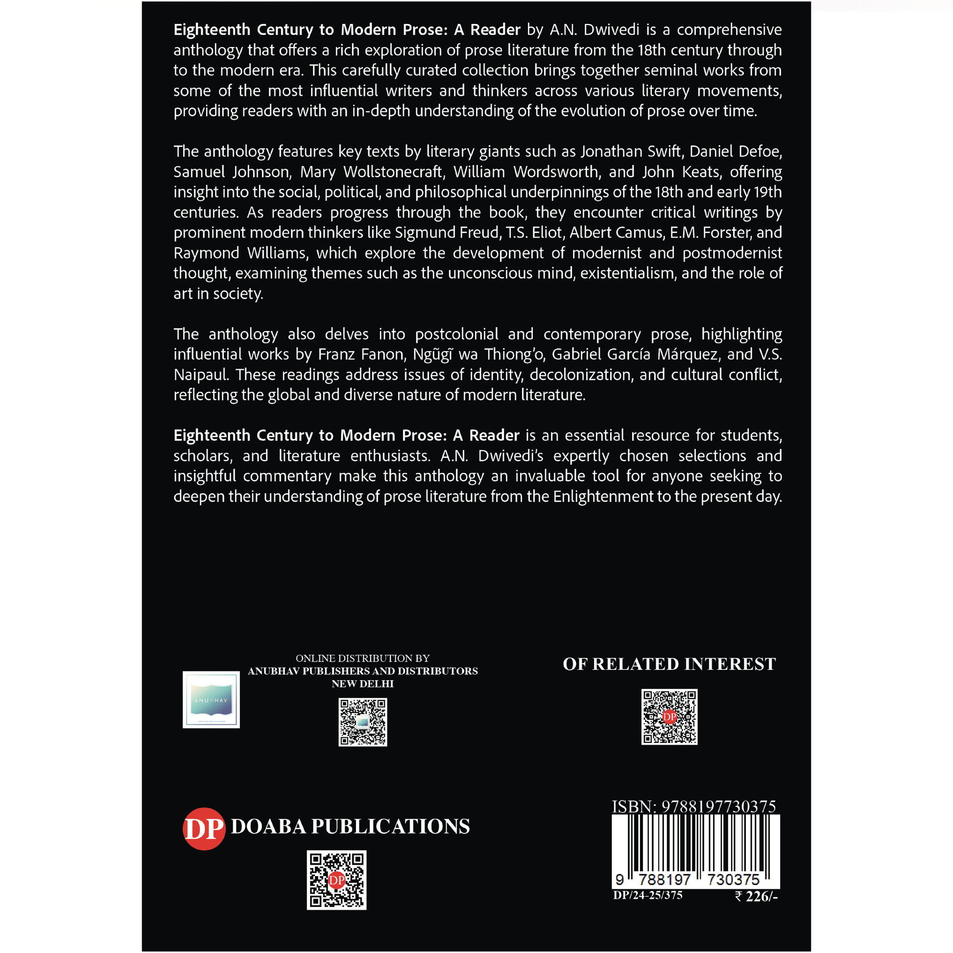 "Eighteenth Century to Modern Prose: A Reader" is an essential resource for students, scholars, and literature enthusiasts. A.N. Dwivedi's expertly chosen selections and insightful commentary make this anthology an invaluable tool for anyone seeking to deepen their understanding of prose literature from the Enlightenment to the present day.