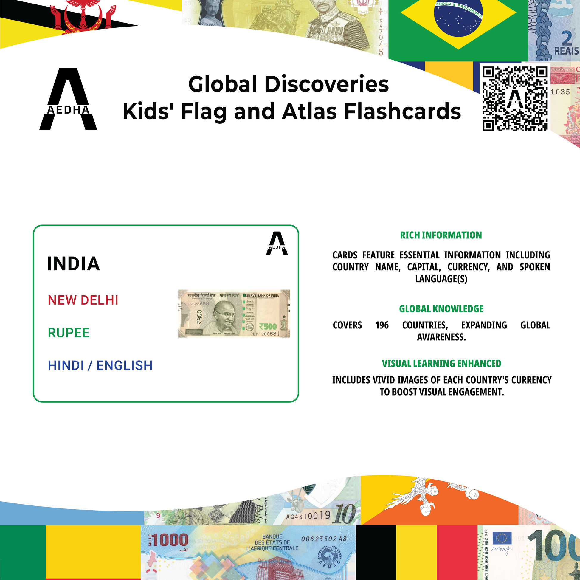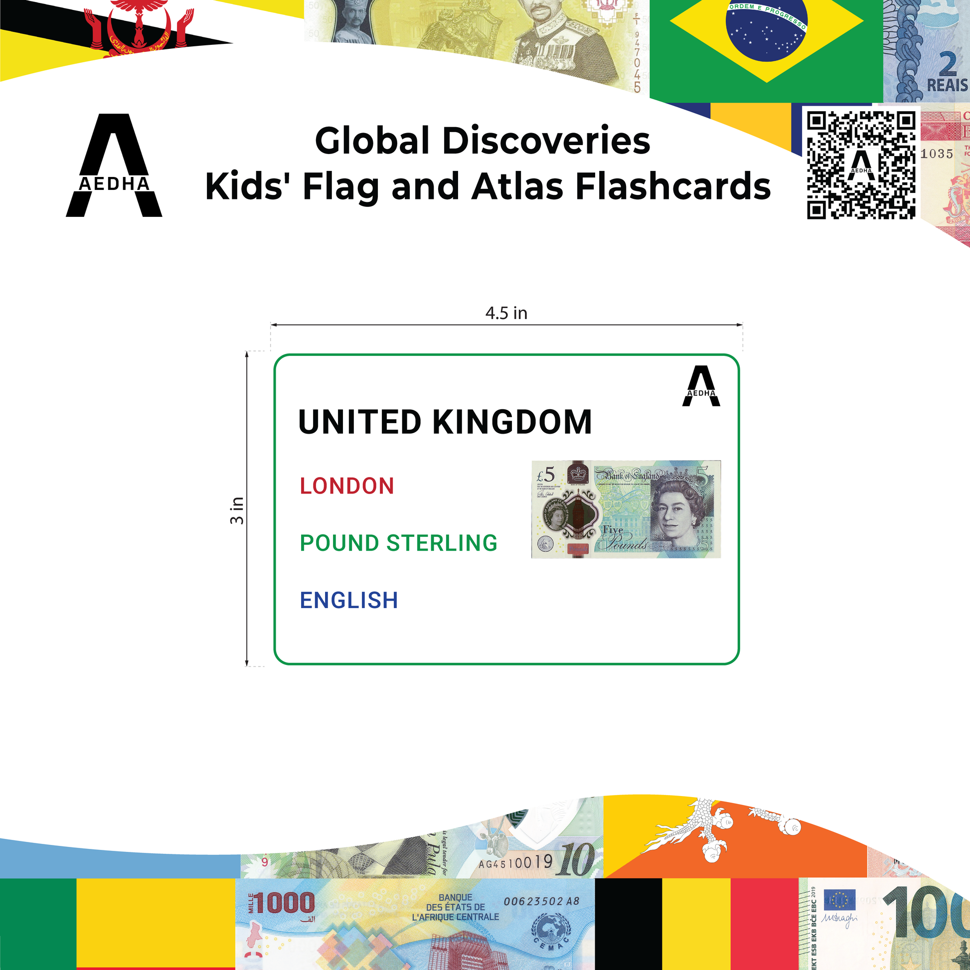 Unleash the world explorer in your child with Global Discoveries Kids' Flag and Atlas Flashcards. Thoughtfully designed to spark curiosity and facilitate learning, these flashcards are a dynamic way to explore diverse cultures, geographies, and flags from around the world. Perfect for homeschooling or as a fun educational game, they provide more than just information—they are gateways to a global adventure. Each card features rounded edges for safer, child-friendly handling and is optimally sized at 3.5 x 4.5 inches for enhanced visibility and easy grip by small hands. The cards contain comprehensive details such as the country's name, capital, currency, and primary spoken language, which foster a deeper understanding. Vivid images of each country's currency enhance visual learning, making complex concepts more graspable. Covering 196 countries, the set offers a thorough introduction to world geography and encourages a global perspective from a young age. Specifically tailored for curious minds aged 5 and up, these flashcards are crafted from durable 300 GSM paper with a matte lamination coating to protect against spills and facilitate easy cleaning, ensuring longevity and maintaining quality. Whether used in the classroom, at home, or during travel, the Global Discoveries Kids' Flag and Atlas Flashcards are an essential tool for every young learner’s educational journey, equipping them with knowledge in a fun, interactive, and safe manner.