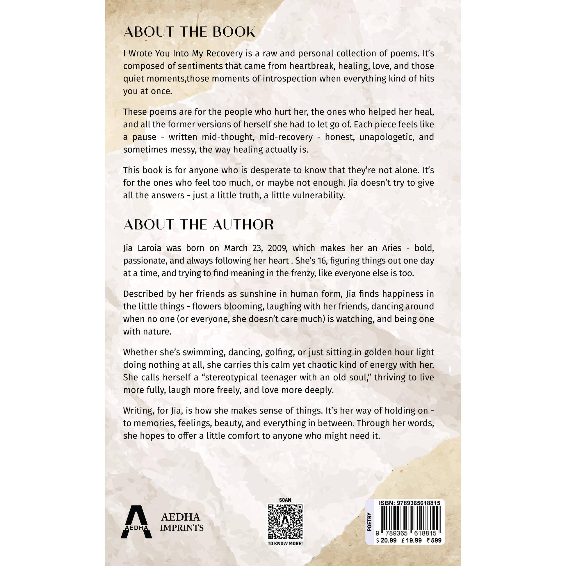 I Wrote You Into My Recovery by Jia Laroia is a heartfelt collection of poems that explore healing, love, heartbreak, and rediscovery. Written with honesty and emotional depth, these poems capture the rawness of recovery and the beauty of vulnerability. Jia’s words speak to those who feel deeply and seek comfort in knowing they are not alone. Each piece is an intimate reflection of courage, growth, and emotional truth. A poetic journey of resilience, this 2025 debut edition by Aedha Imprints is a must-read for lovers of contemporary poetry and self-expression.