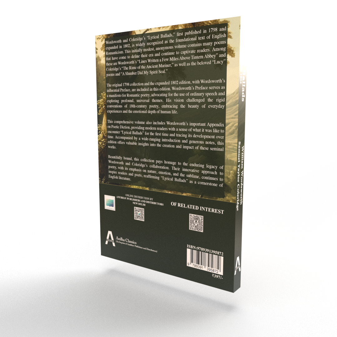 Lyrical Ballads: 1798 and 1802 is a cornerstone of English Romanticism, first published in 1798 and expanded in 1802. This collection by William Wordsworth and Samuel Taylor Coleridge is foundational to the English Romantic movement, featuring timeless poems that explore the beauty of nature, the depth of human emotion, and the power of ordinary speech. Among the notable works are Wordsworth’s “Lines Written a Few Miles Above Tintern Abbey” and Coleridge’s “The Rime of the Ancient Mariner,” as well as beloved “Lucy” poems and “A Slumber Did My Spirit Seal.” This edition includes the original 1798 collection and the expanded 1802 edition, with Wordsworth’s influential Preface advocating for the use of everyday language in poetry and exploring profound, universal themes. Wordsworth's vision challenged the rigid conventions of 18th-century poetry, embracing the emotional richness of human experience and the sublime beauty of the natural world. Additionally, this comprehensive volume features Wordsworth’s important Appendix on Poetic Diction, providing insights into the creative process and historical context of these seminal works. Accompanied by a wide-ranging introduction and generous notes, this edition offers a deeper understanding of the enduring legacy of Wordsworth and Coleridge's collaboration. Bound beautifully, this collection is a tribute to the enduring impact of Romantic poetry, inspiring readers and poets alike with its innovative approach to the art form. Lyrical Ballads continues to captivate and reaffirm its place as a critical work in the history of English literature.