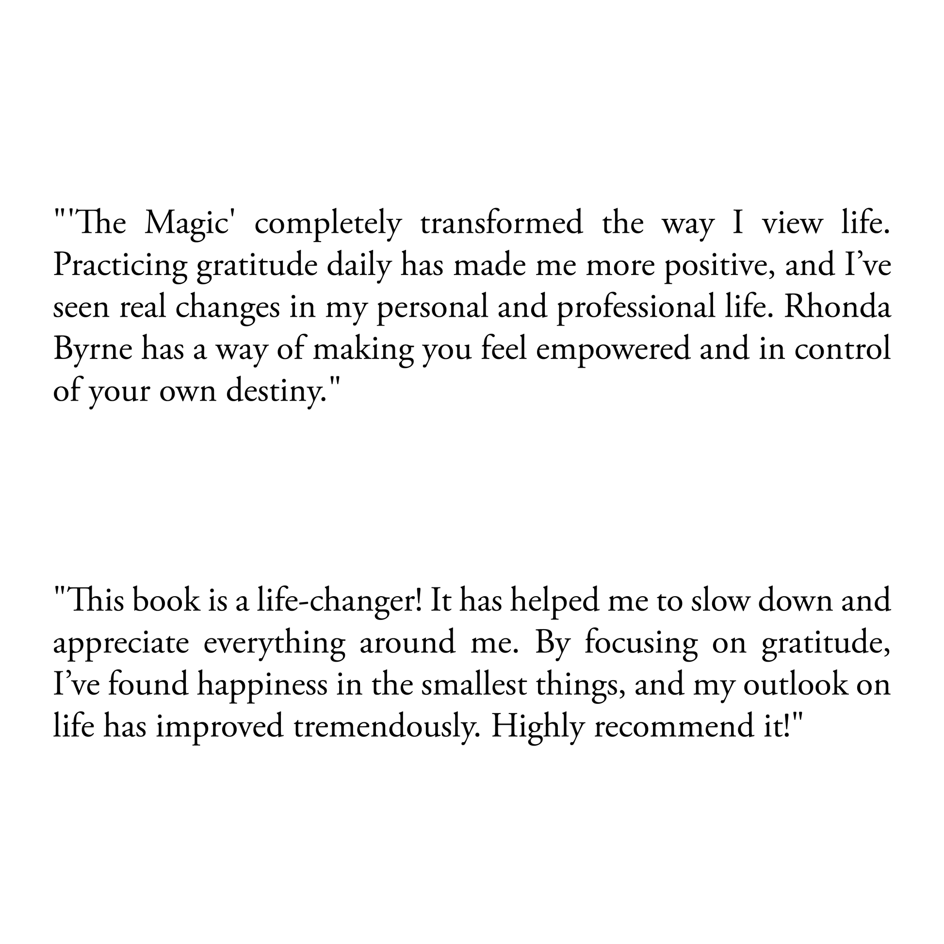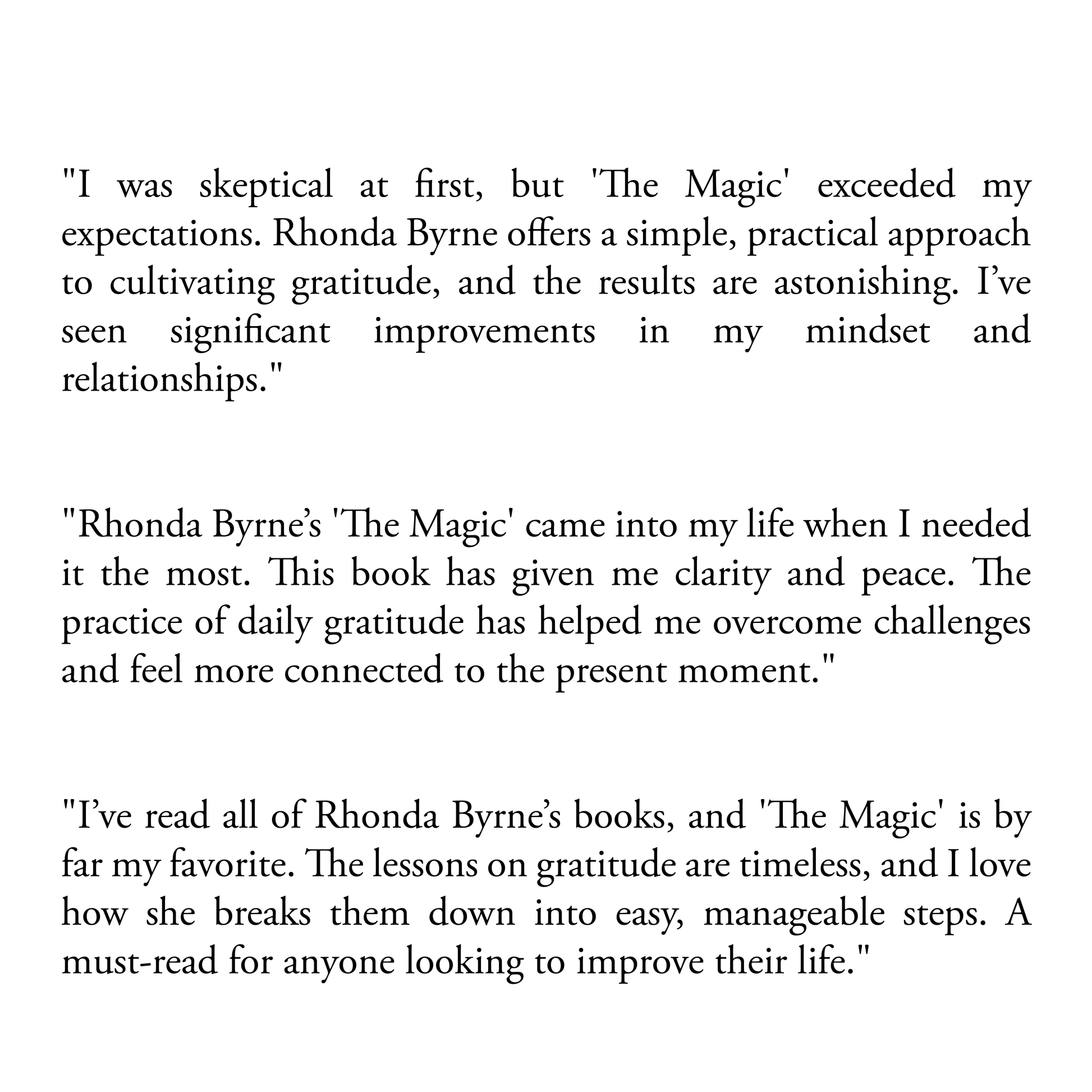 Gratitude is one of the most powerful gifts humanity possesses, and Rhonda Byrne highlights this in her book. With a gentle yet profound approach, she reveals the miracles and power of practicing gratitude and how it can profoundly improve your life. 'The Magic' demonstrates how a single thought can alter the course of your life, providing insights and motivation to help you make positive changes and achieve personal growth. It is a continuation of her journey from 'The Power', offering life-changing lessons that guide readers toward spiritual enlightenment.