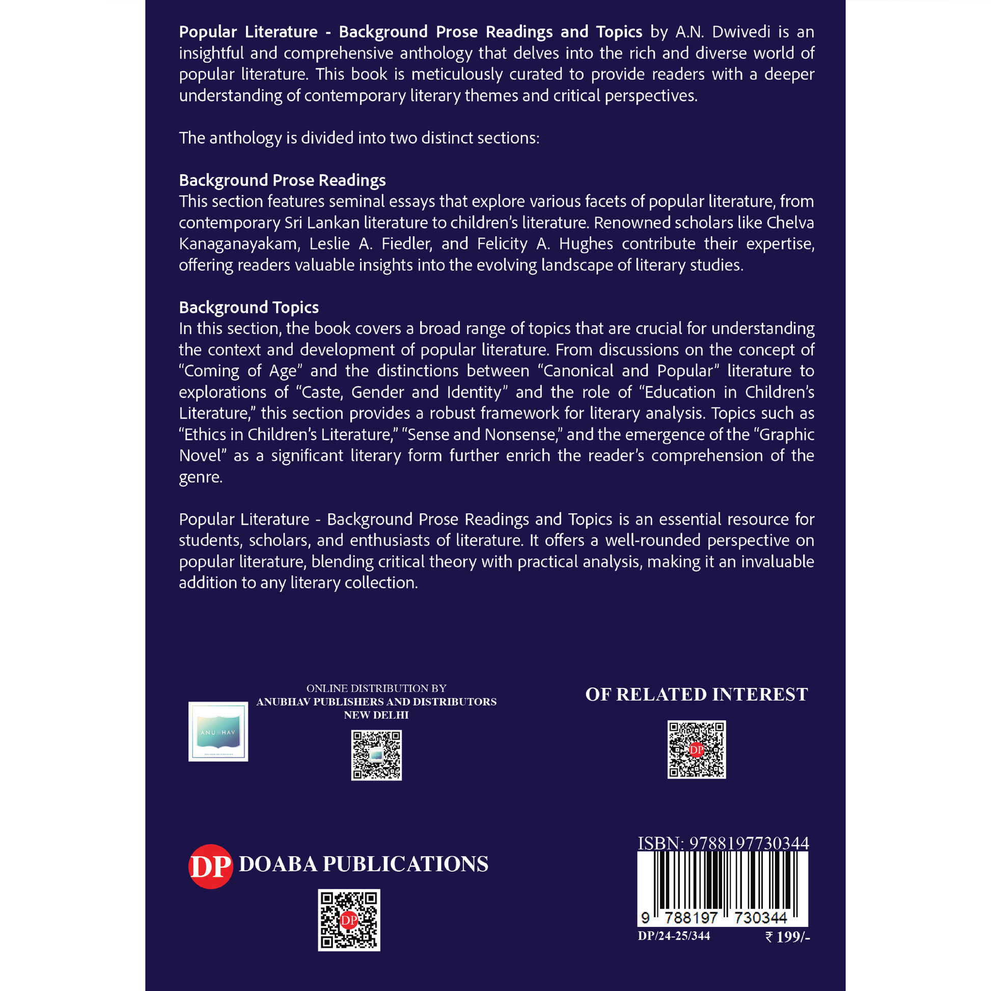 "Popular Literature: Background Prose Reading and Topics," edited by A.N. Dwivedi, is an insightful and comprehensive anthology that delves into the rich and diverse world of popular literature. This book is meticulously curated to provide readers with a deeper understanding of contemporary literary themes and critical perspectives.