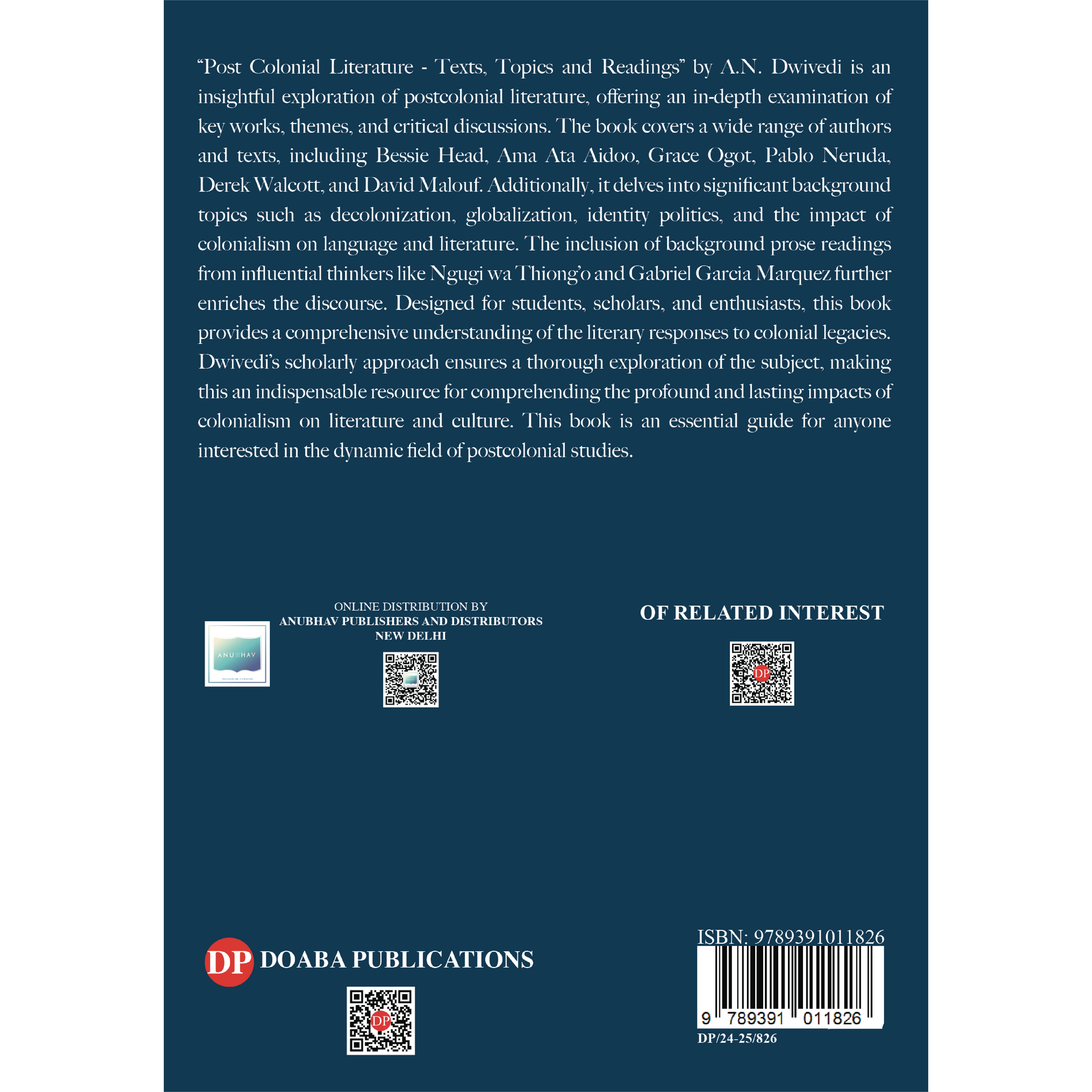 "Post-Colonial Literature: Texts, Topics, and Readings" by A.N. Dwivedi is an insightful exploration of postcolonial literature, offering an in-depth examination of key works, themes, and critical discussions. The book covers a wide range of authors and texts, including Bessie Head, Ama Ata Aidoo, Grace Ogot, Pablo Neruda, Derek Walcott, and David Malouf. Additionally, it delves into significant background topics such as decolonization, globalization, identity politics, and the impact of colonialism on language and literature. The inclusion of background prose readings from influential thinkers like Ngugi wa Thiong'o and Gabriel Garcia Marquez further enriches the discourse. Designed for students, scholars, and enthusiasts, this book provides a comprehensive understanding of the literary responses to colonial legacies. Dwivedi's scholarly approach ensures a thorough exploration of the subject, making this an indispensable resource for comprehending the profound and lasting impacts of colonialism on literature and culture. This book is an essential guide for anyone interested in the dynamic field of postcolonial studies.