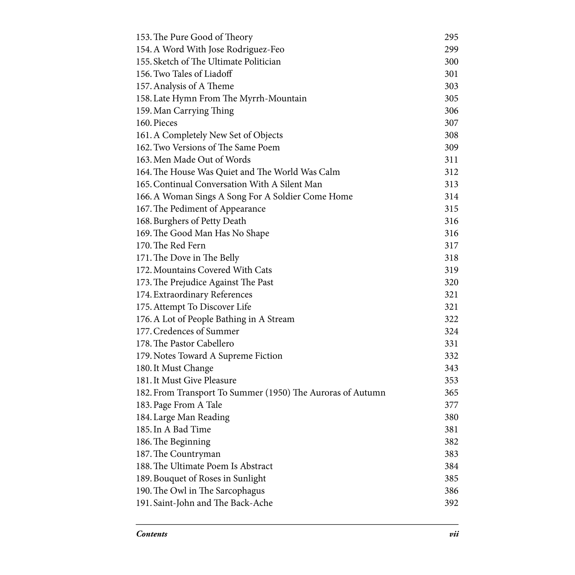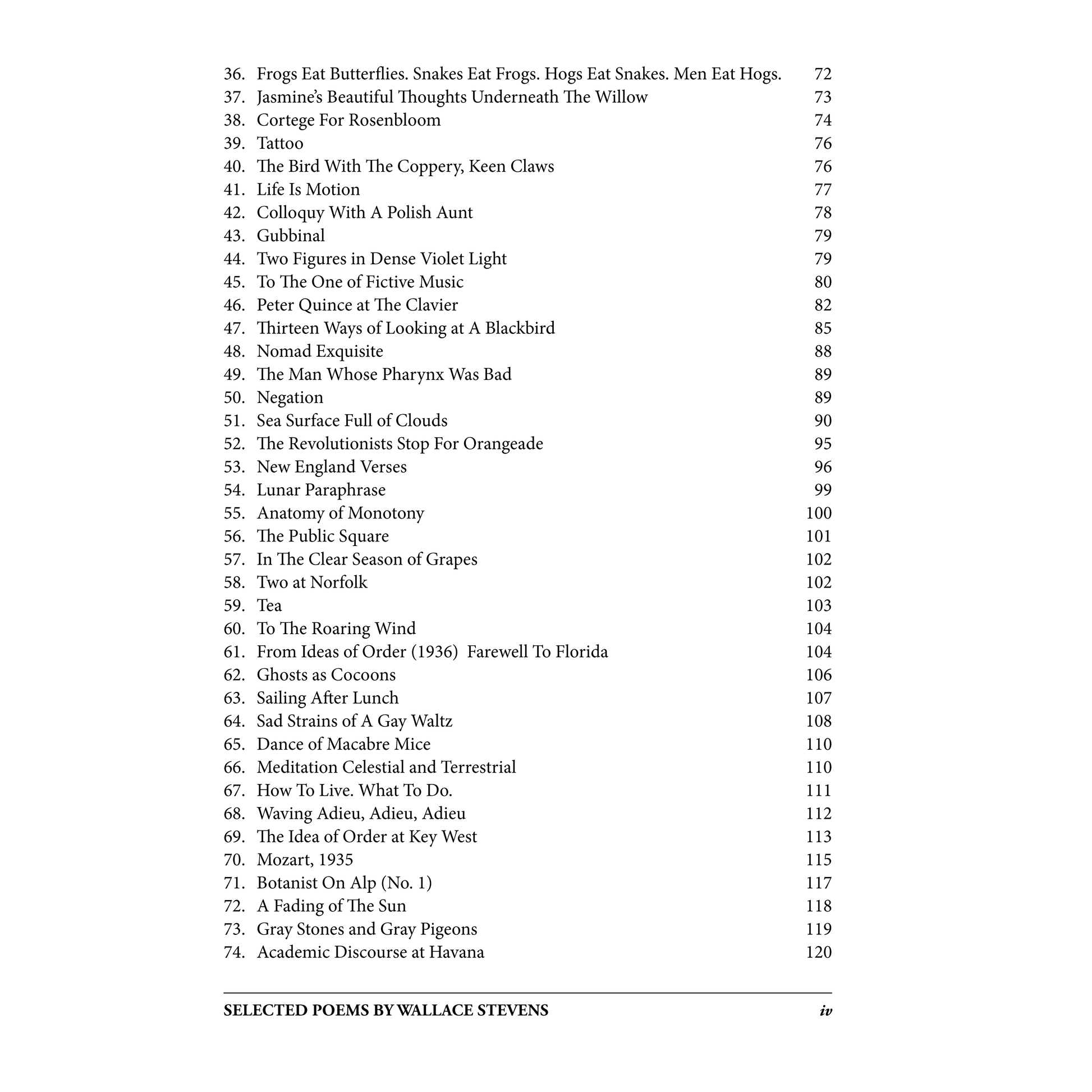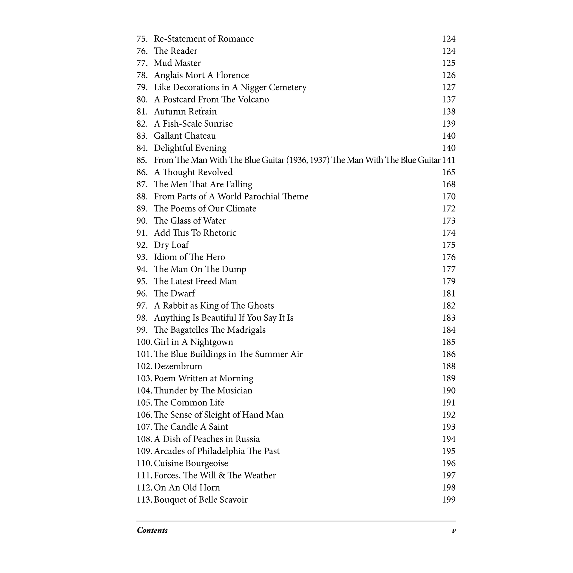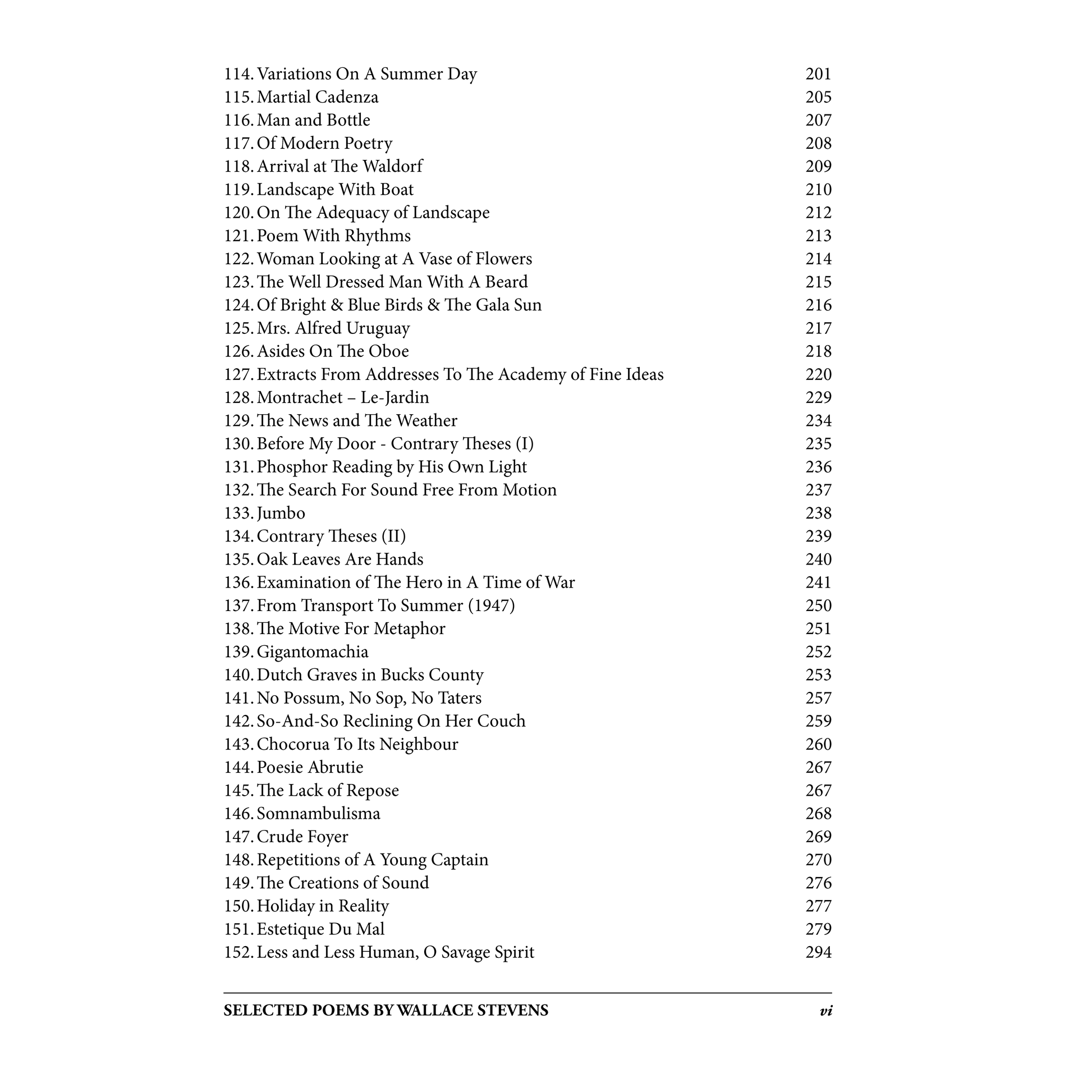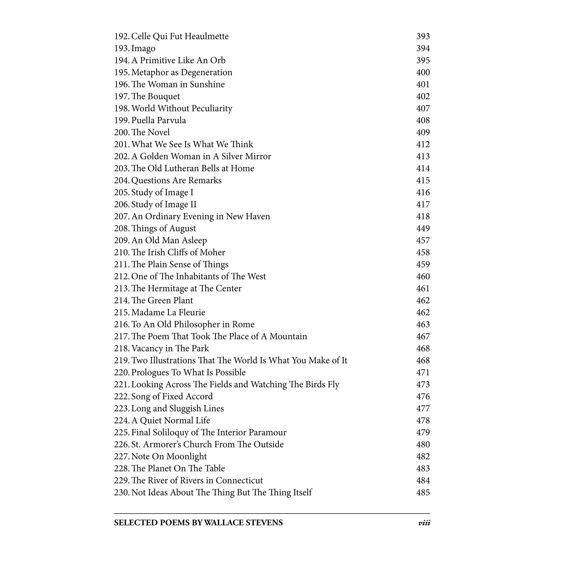 - 230 carefully curated poems spanning Stevens' poetic career.
