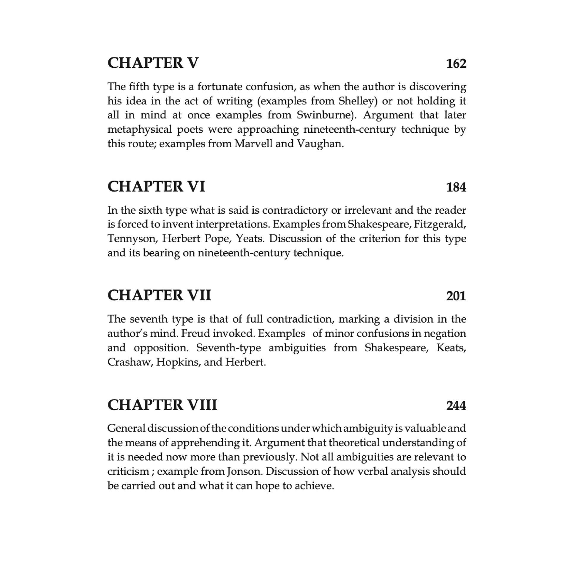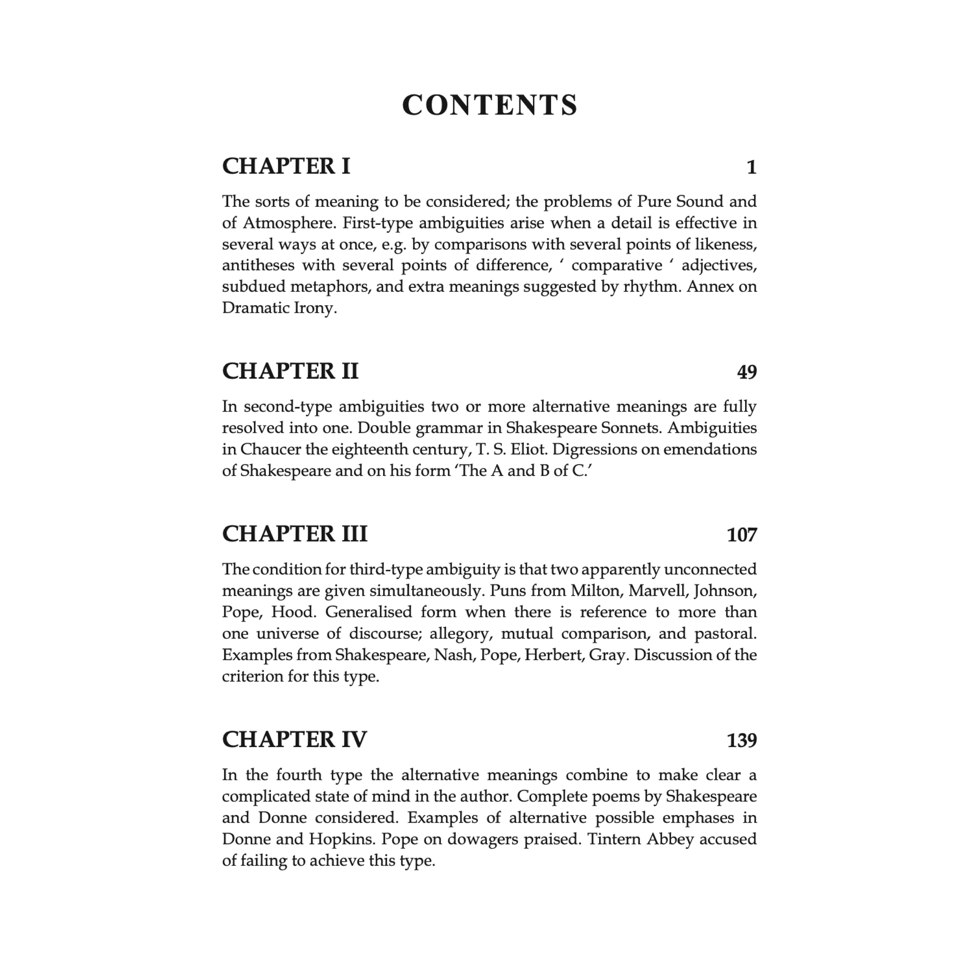Empson categorizes ambiguity into seven distinct types, ranging from simple double meanings to complex paradoxes that challenge conventional literary understanding. Drawing from literary giants such as Shakespeare, John Donne, and T. S. Eliot, Empson illustrates how ambiguity is not a flaw, but a core feature of poetic beauty and intellectual depth.