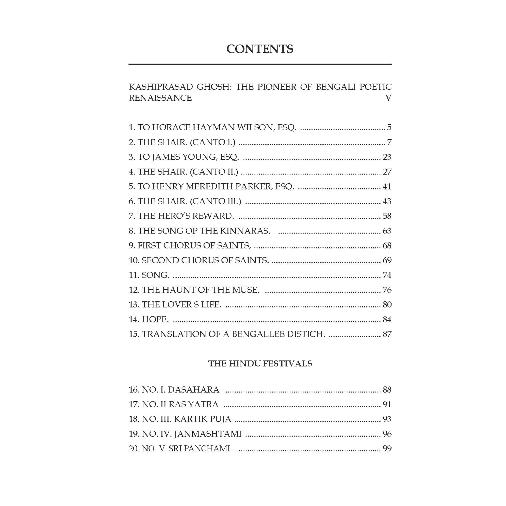 This anthology includes some of Ghosh's most significant works, such as the epic "The Shair," presented in multiple cantos, and poems like "The Hero's Reward" and "The Haunt of the Muse." These pieces reflect his deep engagement with both classical and contemporary themes, offering insights into the cultural and social landscape of his time.