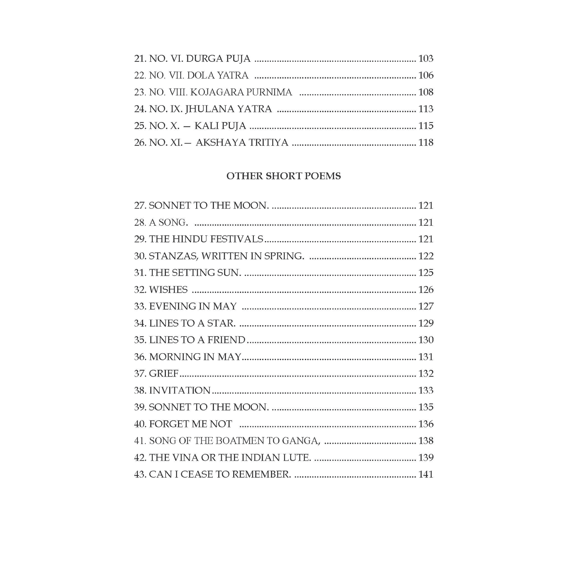 The collection also explores Hindu festivals through poems like "Kartik Puja" and "Durga Puja," where Ghosh's reverence for his cultural heritage is beautifully articulated. In the section of short poems, readers will find reflections on nature, love, and life, with pieces like "Sonnet to the Moon" and "Mourning in May" showcasing his lyrical prowess and keen observations.