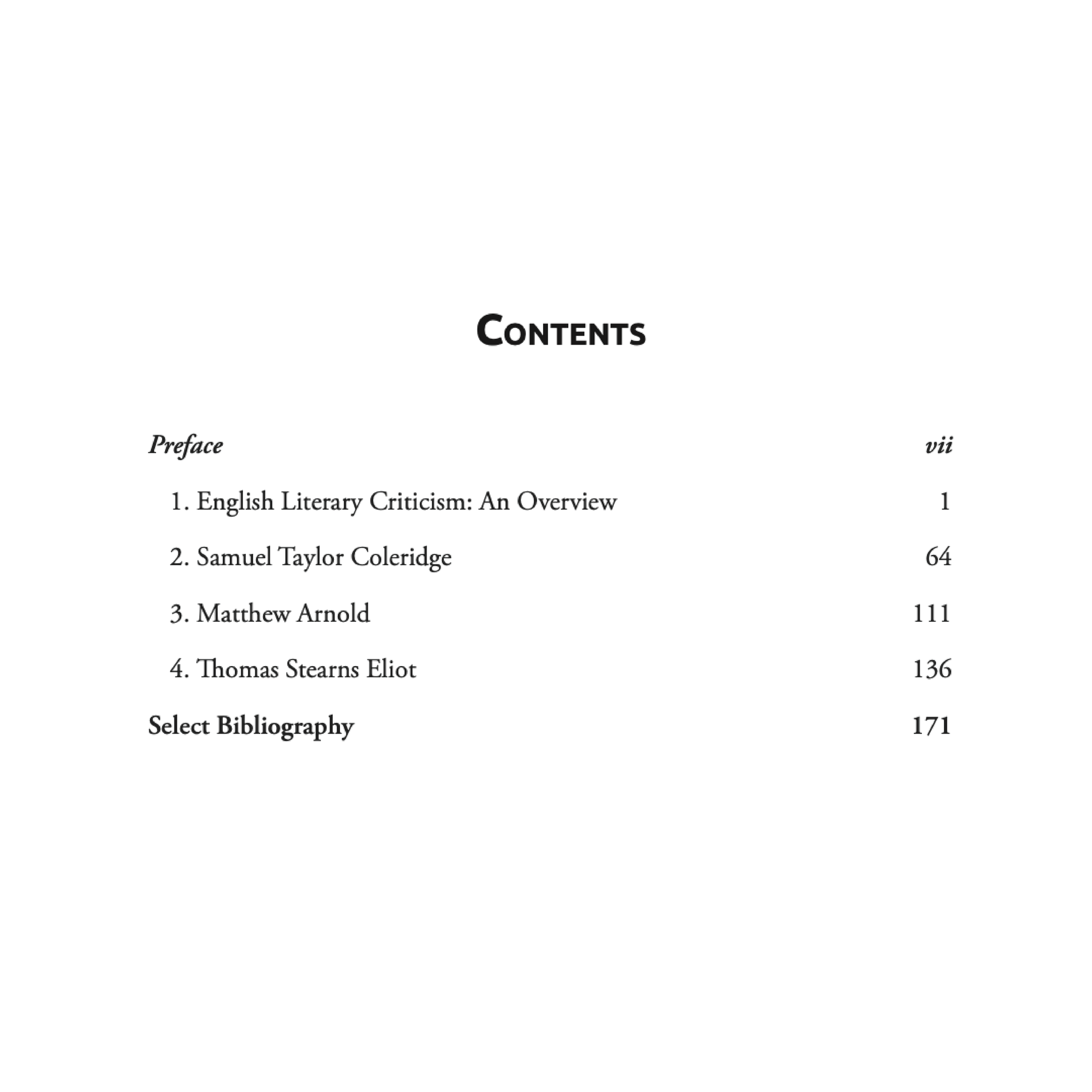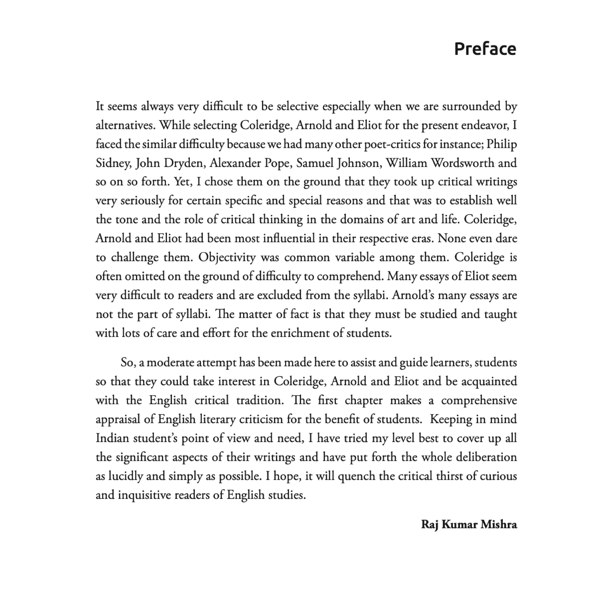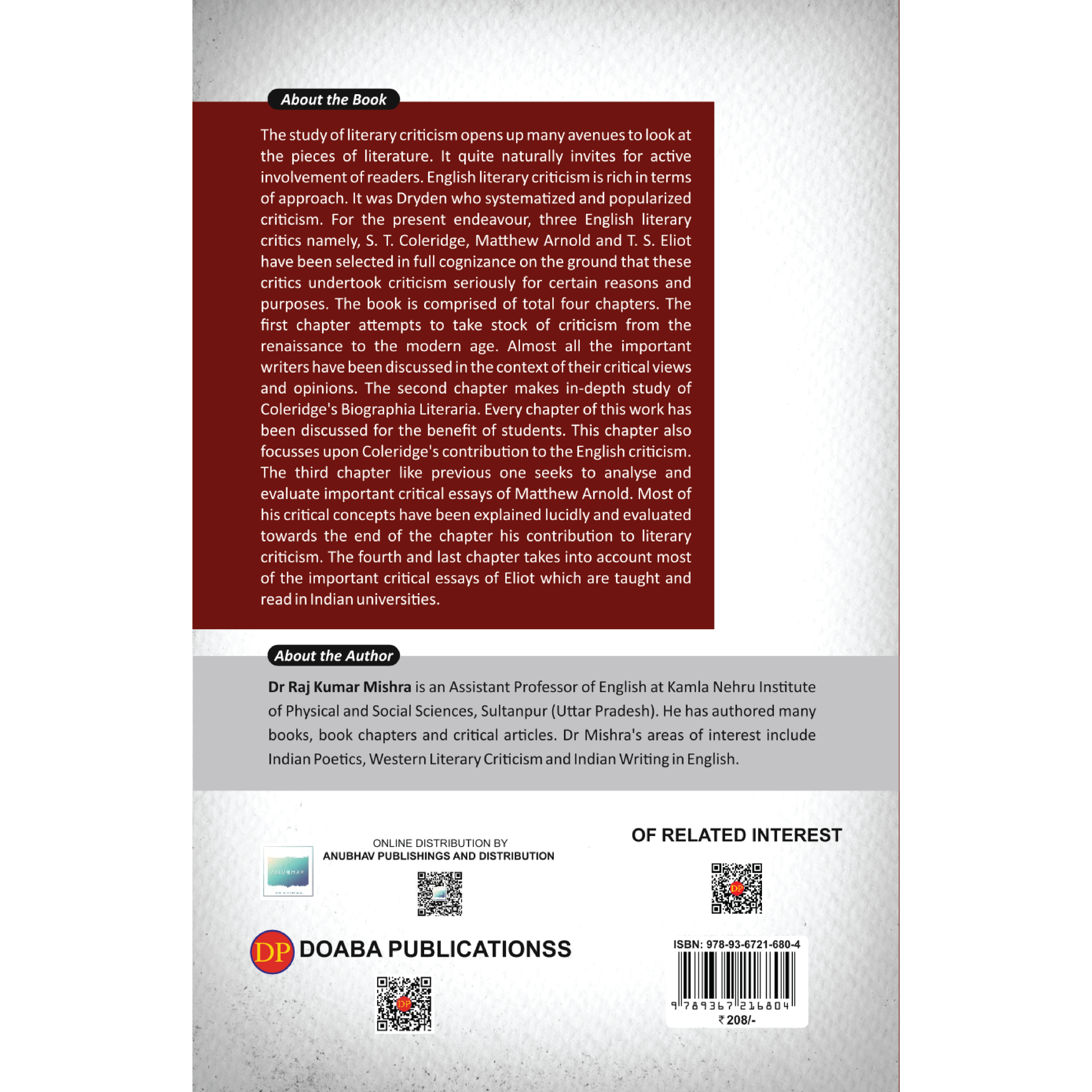 Biographia Literaria, analyzing his critical philosophy and its significance in literary studies. The third chapter provides a thorough examination of Matthew Arnold’s critical essays, explaining his literary theories and their lasting impact. The final chapter covers the essential critical essays of T. S. Eliot, which continue to be central to literary studies in universities worldwide.