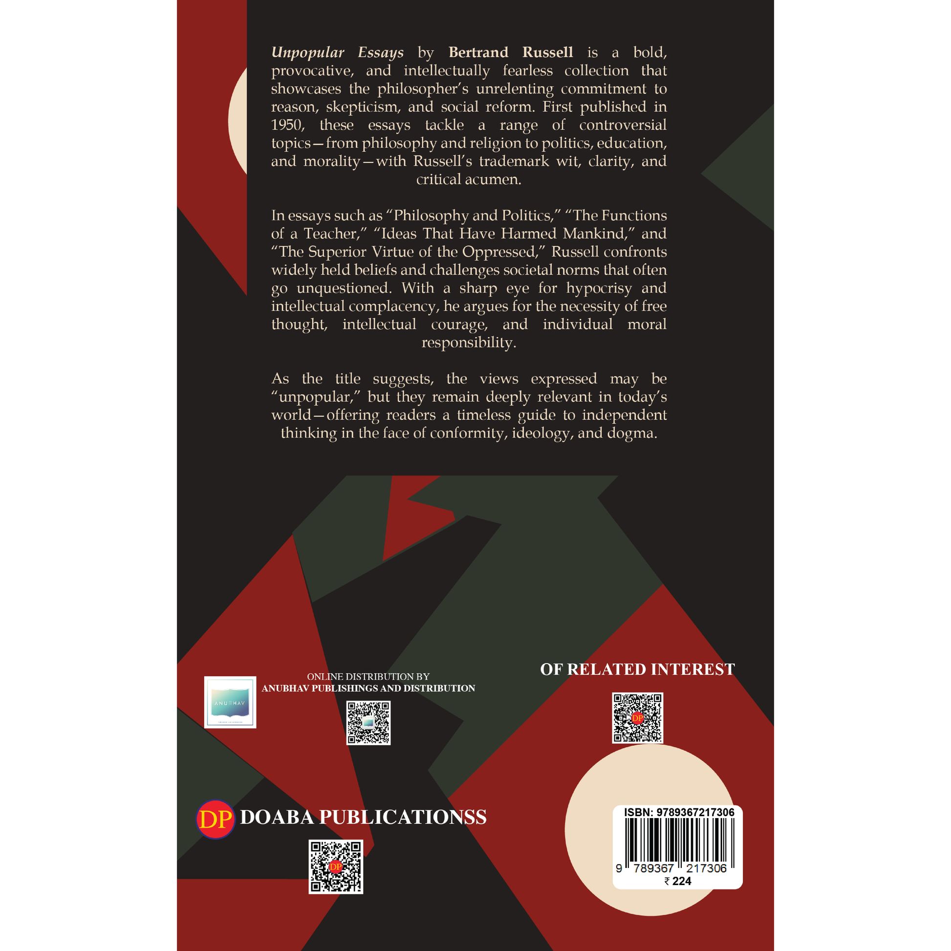 Unpopular Essays is Bertrand Russell’s intellectually fearless collection where each piece aims to stimulate debate, reflection, and social awareness. Russell argues against blind faith, mass opinion, and ideological rigidity with unmatched eloquence and reason.