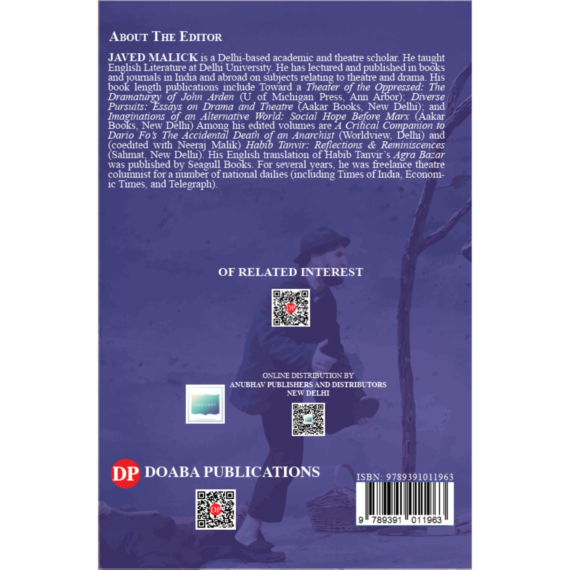 JAVED MALICK is a Delhi-based academic and theatre scholar. He taught English Literature at Delhi University. He has lectured and published in books and journals in India and abroad on subjects relating to theatre and drama. His book length publications include Toward a Theater of the Oppressed: The Dramaturgy of John Arden (U of Michigan Press, Ann Arbor); Diverse Pursuits: Essays on Drama and Theatre (Aakar Books, New Delhi); and Imaginations of an Alternative World: Social Hope Before Marx (Aakar Books, New Delhi). Among his edited volumes are A Critical Companion to Dario Fo’s The Accidental Death of an Anarchist (Worldview, Delhi) and (coedited with Neeraj Malik) Habib Tanvir: Reflections & Reminiscences (Sahmat, New Delhi). His English translation of Habib Tanvir’s Agra Bazar was published by Seagull Books. For several years, he was freelance theatre columnist for a number of national dailies (including Times of India, Economic Times, and Telegraph).